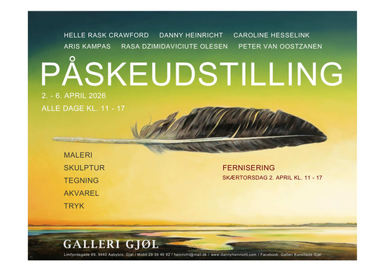 Op donderdag 2 april om 11:00uur is de feestelijke opening bij Gallerie Gjøl van het nieuwe seizoen met een Paastentoonstelling. Dit jaar met zes getalenteerde kunstenaars uit Denemarken en Nederland. Paintings, drawings, art prints and sculptures by the artists Helle Rask Crawford, Danny Heinricht, Caroline Hesselink, Aris Kampas, Rasa Dzimidaviciute Olesen and Peter van Oostzanen.