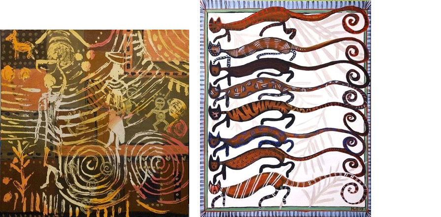 Een andere belangrijke inspiratiebron is Afrikaanse etnische kunst en Aboriginal kunst waarin symbolen zijn verwerkt.