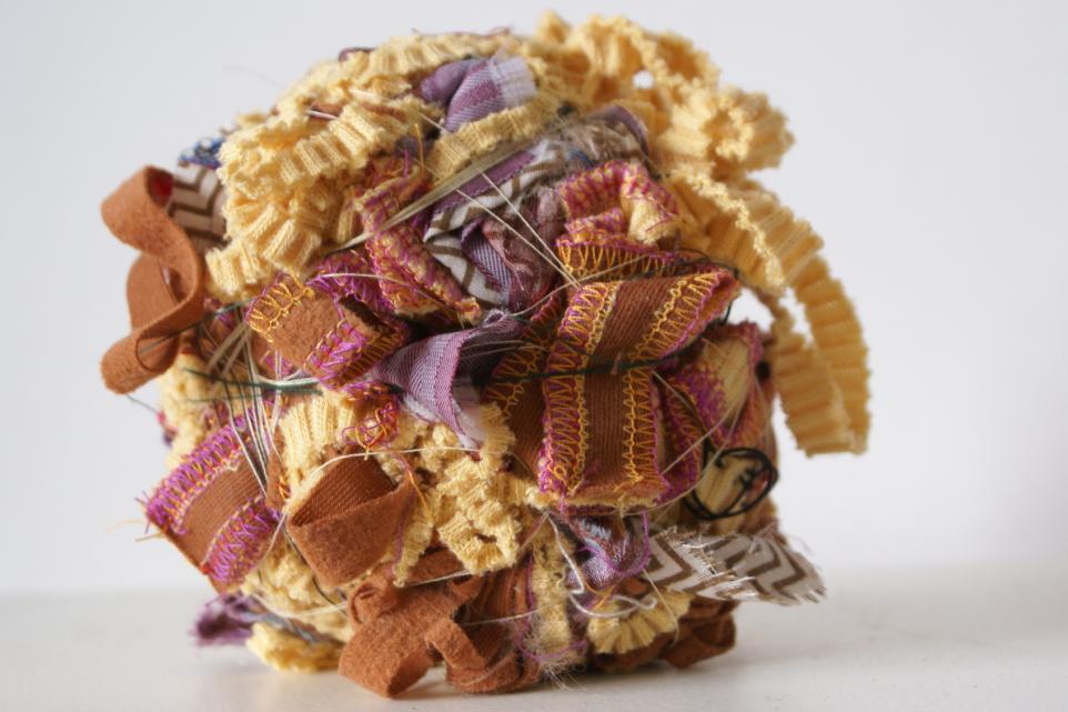 Marja is in haar atelier altijd bezig met veel verschillende materialen. Ze maakt o.a. sieraden van textiel. Ook heeft ze een tijdje weefsels gemaakt van zelfgemaakte draden van stof, draad en papier. Het materiaal wat over was gooide ze niet weg maar ze deed het in een doosje. Het heeft heel wat tijd gekost om er achter te komen wat ze met dit restmateriaal kon doen. Toen ontdekte ze deze mooie vorm. Eigenlijk gewoon een bolletje maken. Een heel eenvoudige handeling. Het bolletje laat voor mij de schoonheid van het materiaal zien.