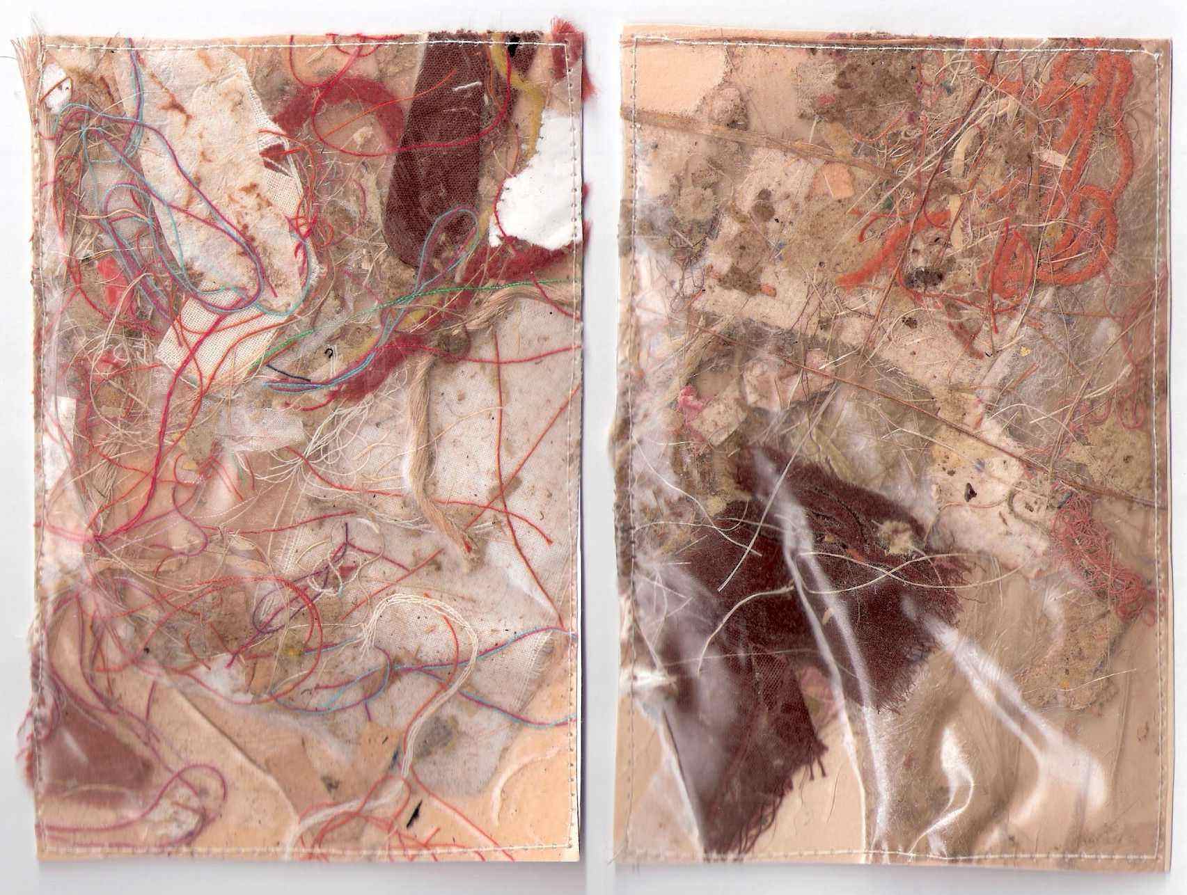“Deze 2 werken horen bij mijn serie wereldborduursels. Ik ben uitgegaan van het nieuws en van foto’s in het nieuws. Ik heb deze 2 foto’s bewerkt en geborduurd op transparante stof.