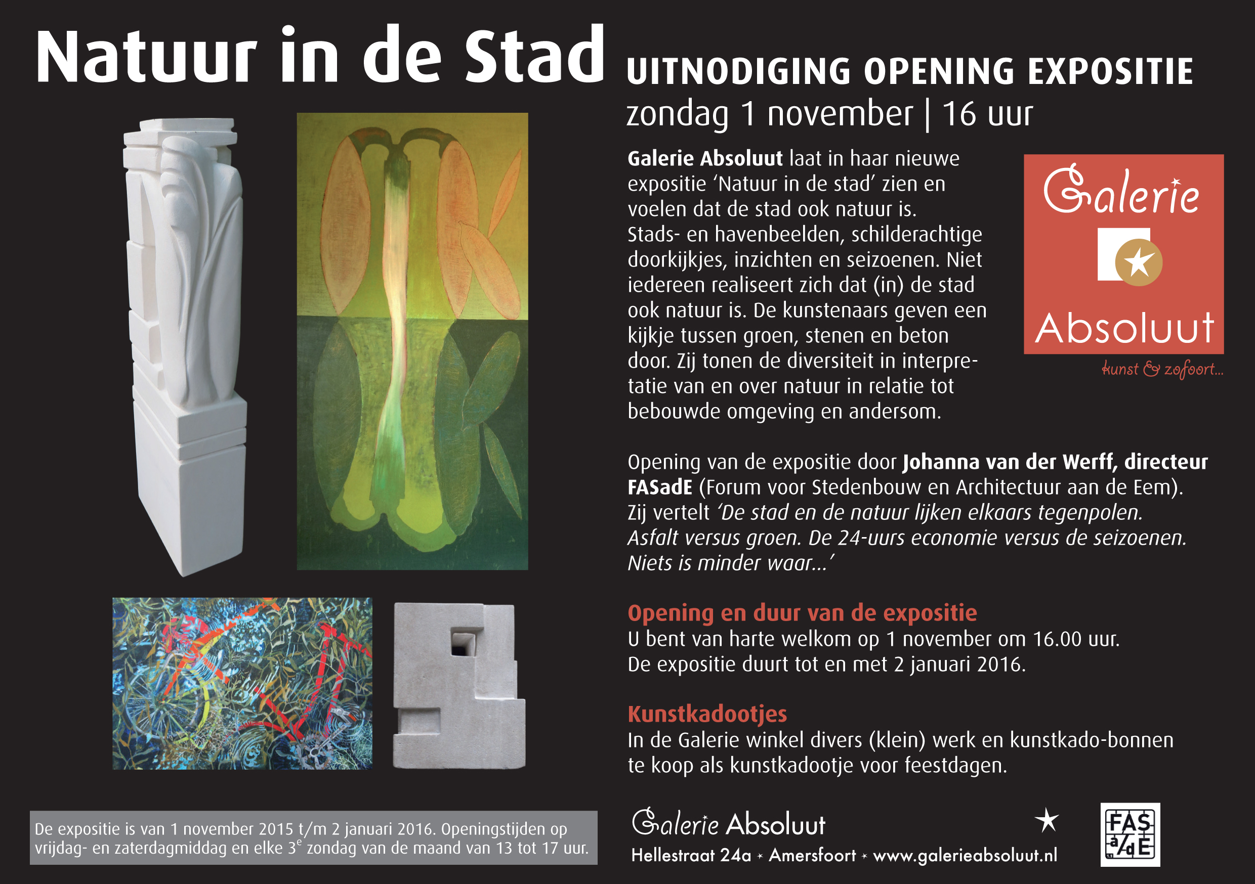 ]Galerie Absoluut laat in haar nieuwe expositie ‘Natuur in de stad’ zien en voelen dat de stad ook natuur is. Stads- en havenbeelden, schilderachtige doorkijkjes, inzichten en seizoenen. Niet iedereen realiseert zich dat (in) de stad ook natuur is. De kunstenaars geven een kijkje tussen groen, stenen en beton door. Zij tonen de diversiteit in interpretatie van en over natuur in relatie tot bebouwde omgeving en andersom.