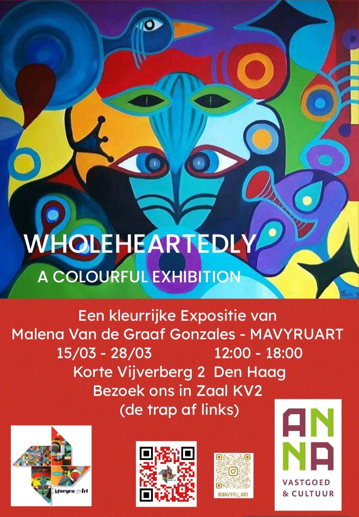 In Anna Vastgoed aan de Korte Vijverberg 2 in Den Haag houdt Malena van de Graaf (Mavyru Art) een overzichtsexpositie van haarwerk. Kleurrijk en Veelzijdig zijn de woorden die het best bij haar werk passen. Van abstract tot bosgezichten en figuratief tot portretten, er zit van alles bij. Alles met een heel zijn te zien in zaal KV. Elke dag is ze zelf aanwezig vanaf 12 tot 6.persoonlijke stijl die ze zich als auto-didact heeft aangeleerd. Ongeveer 80 voorbeelden van haar kunst zijn te zien in zaal KV 2. Malena zal zelf ook iedere dag aanwezig zijn van 12 tot 6. De expositie duurt van 15/3 tm 28/3.