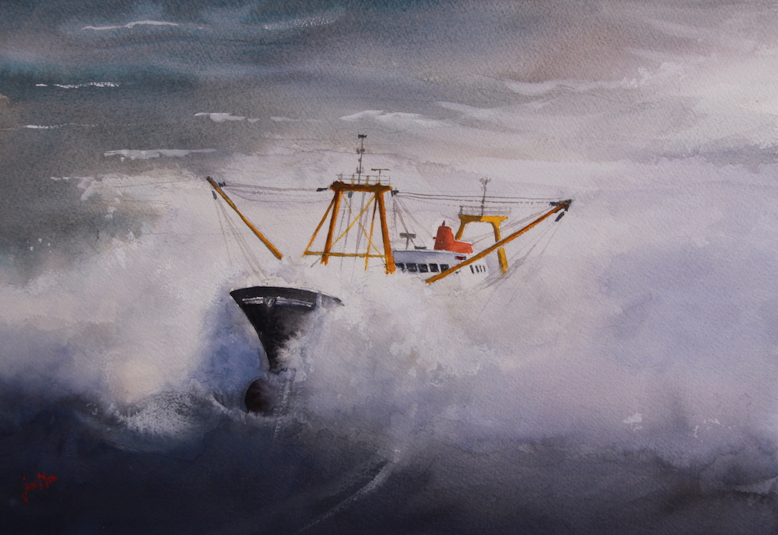 In onderstaande fotoserie is de totstandkoming van van de aquarel 'Fishing in rough sea' te zien.