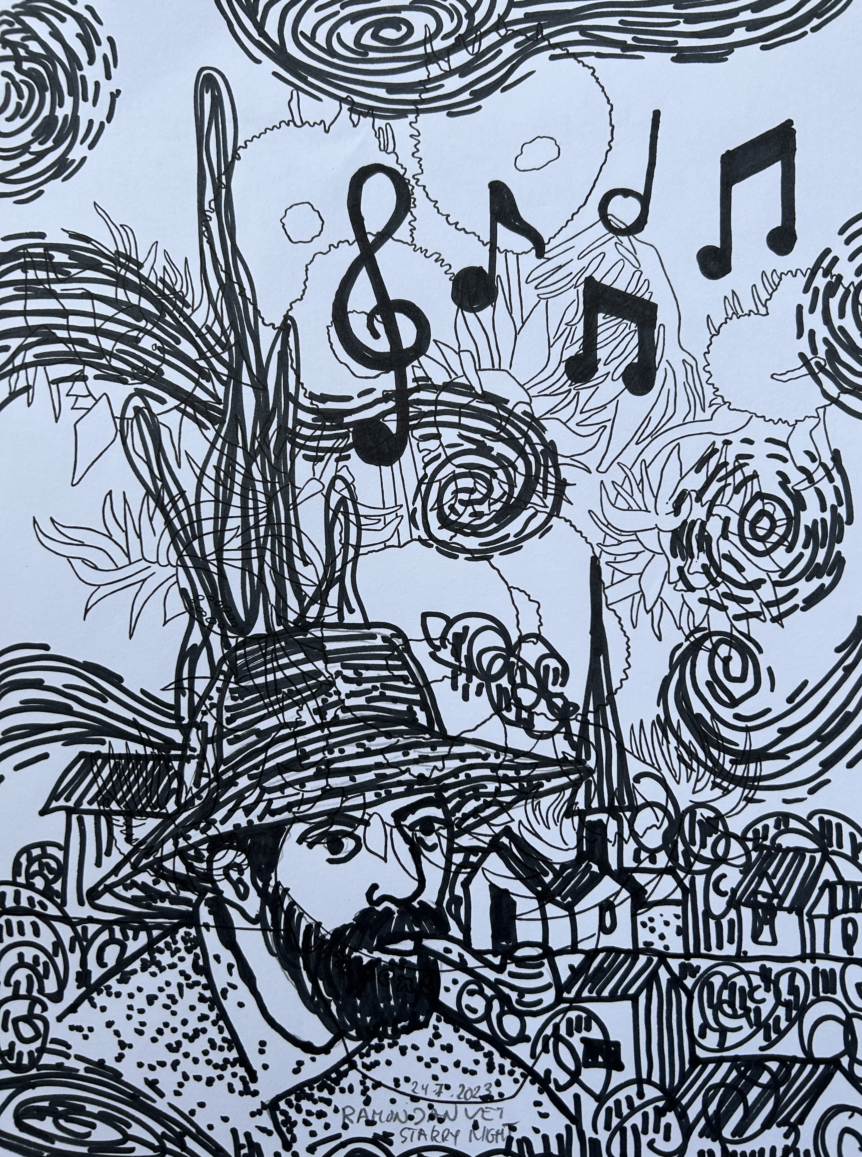 Ik heb een tekening gemaakt geïnspireerd op het werk STARRY STARRY NIGHT van Vincent van Gogh.