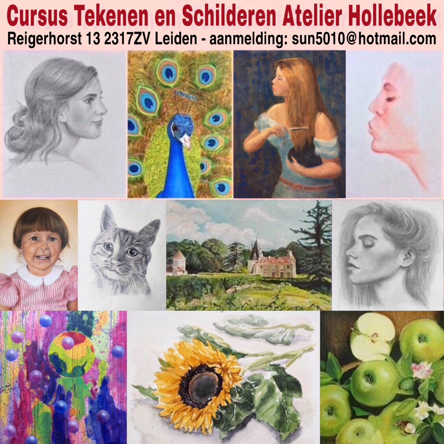 Meld je nu aan voor Cursus Tekenen en Schilderen bij professionele kunstenaar-docent Henk Hollebeek thuis in Leiden! Start van alle lesdagen en tijden: maandag 9 september 2019. Info over lesdagen en tijden, cursuskosten, adres, etc. is te lezen op de bijlage. Aanmelding: