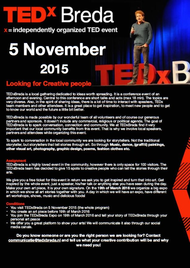Nu zijn wij op zoek naar een andere creatieve manier om de verhalen die die dag verteld worden over te brengen op anderen. Daarom organiseren we op 19 maart een TEDxBreda Expo. Op deze expo krijgen kunstenaars een podium om hun kunst te showen. Kunstenaars, muzikanten, dansers, fotografen, theaterartiesten, dichters/schrijvers, mode designers etc. die deze springplank kunnen gebruiken of het gewoon heel leuk vinden!