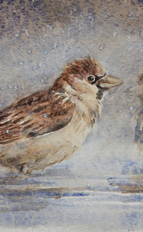 Graag schilder ik met aquarel, acryl of olieverf. De onderwerpen die ik kies zijn zeer divers, maar meestal is er een link is met de natuur. Hierbij: détail van de aquarel Huismussen