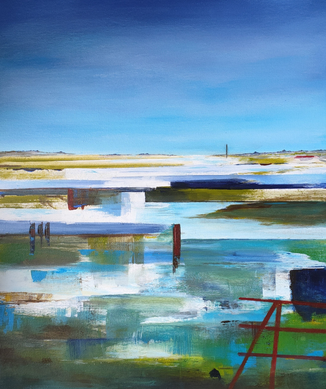 De weidsheid van het wad, wind en water tot aan de horizon. Het is deze weidsheid die ik in mijn landschappen wil laten zien. In dunne lagen olieverf geef ik de tere kleuren tussen land en water weer.
