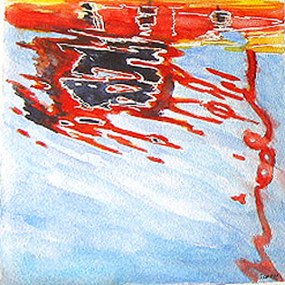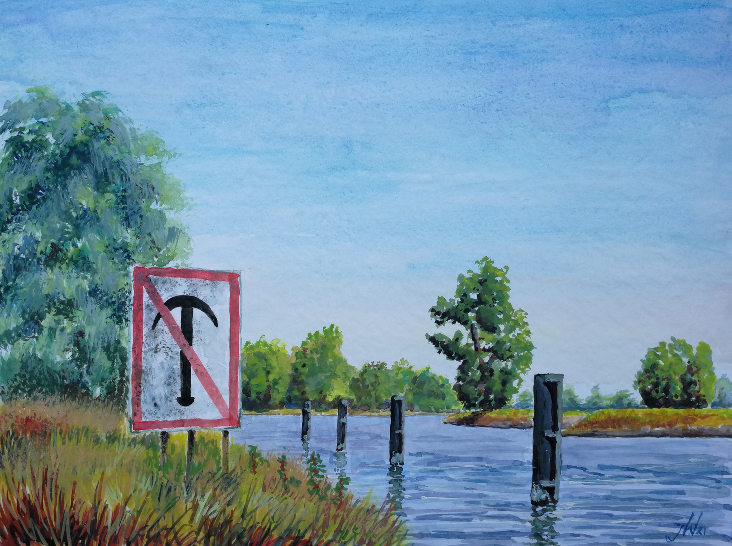 Steigers aan de Rivier, aquarel van landschap