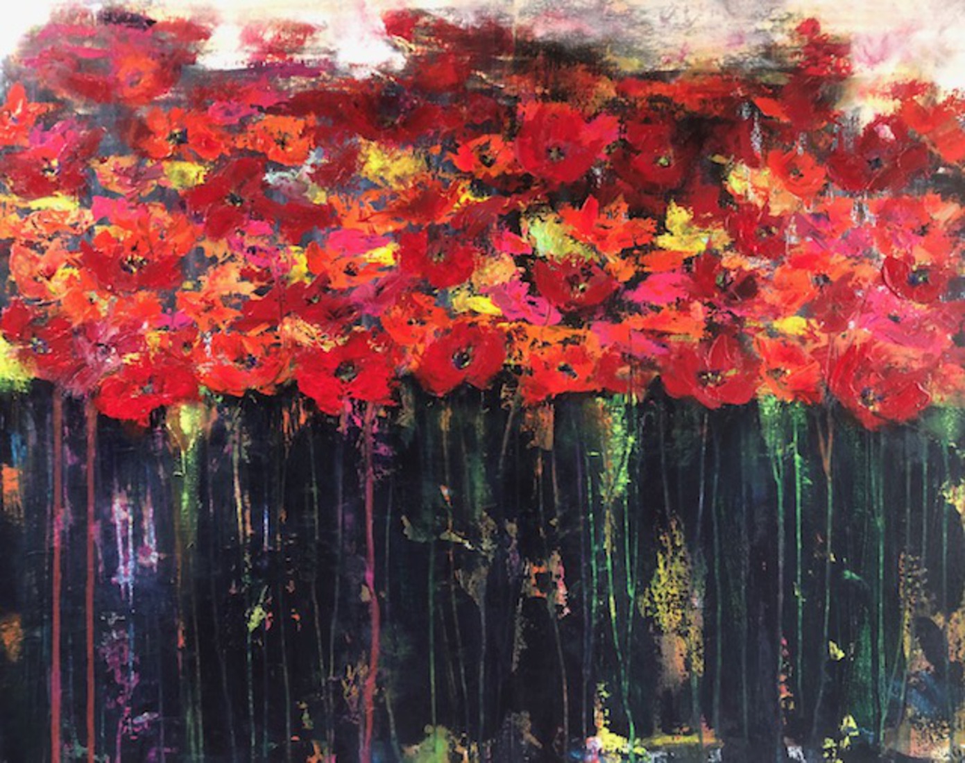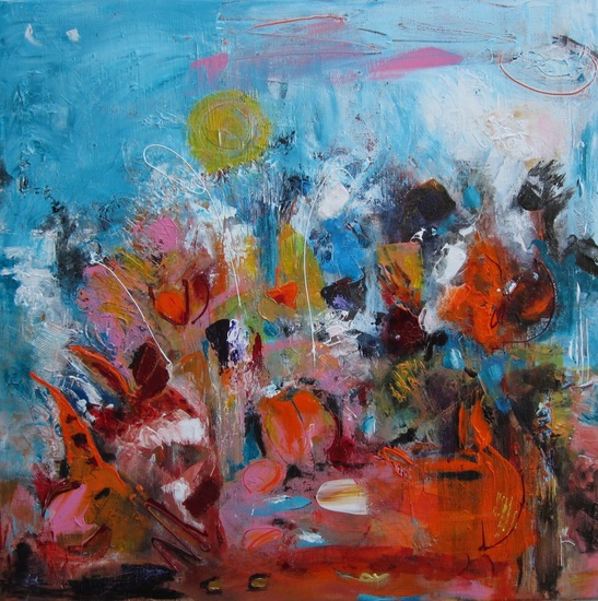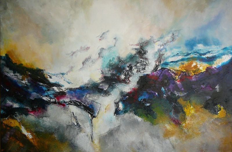 'Traffic-light' - een modern, abstract en groot schilderij van Benfo; samen geschilderd door Ben Vollers & Fons Heijnsbroek; te koop — €1900,00