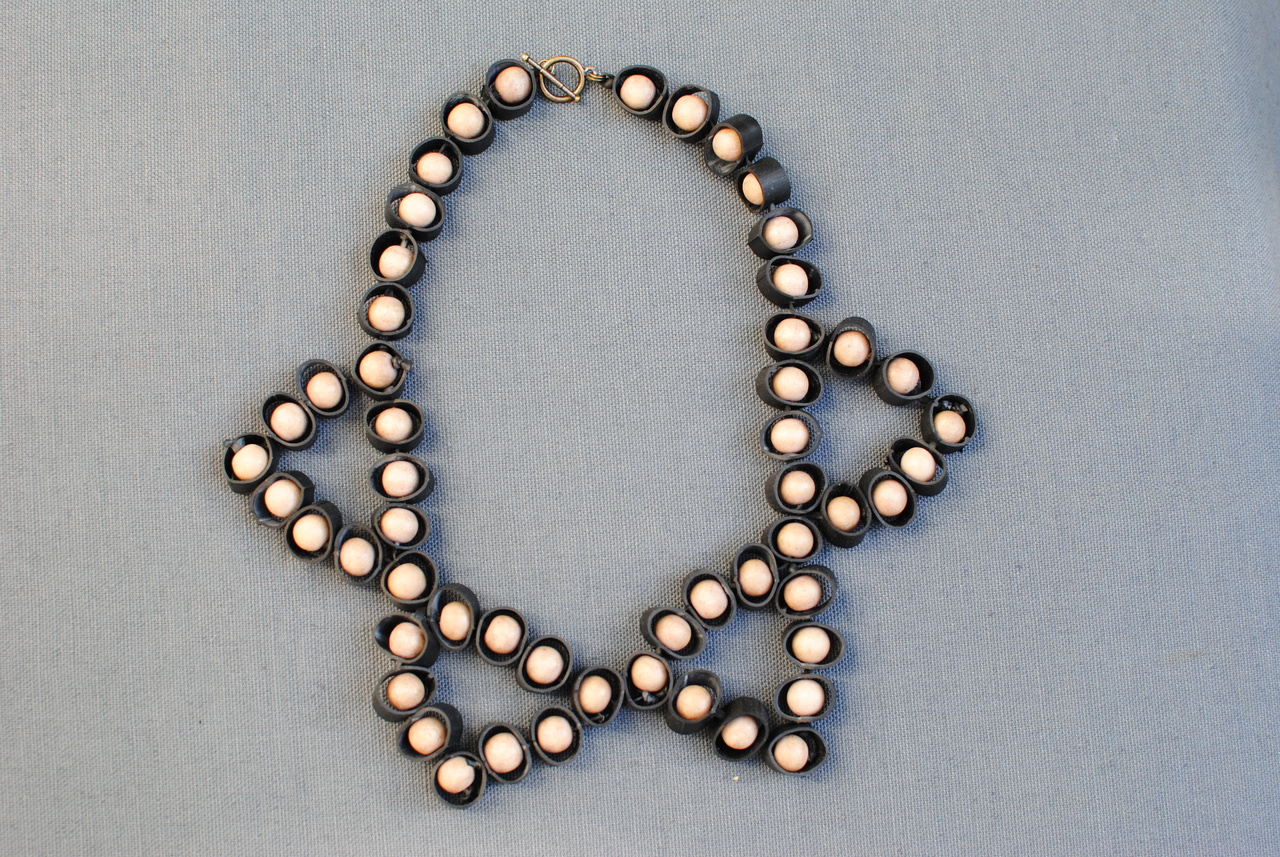 kraag van beige kralen gevat in rubber-ringetjes