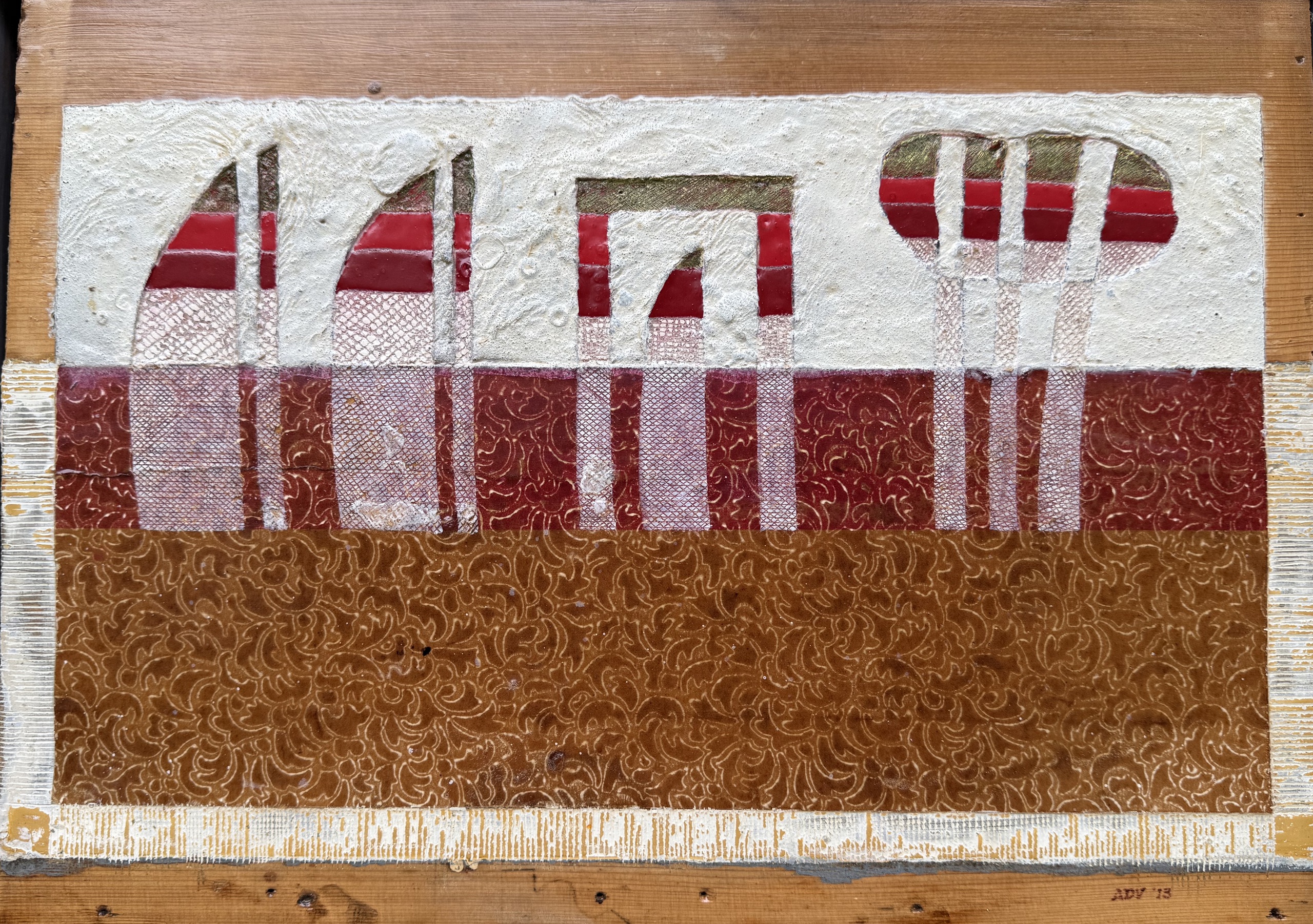 Dikke plank. Oorspronkelijk behang. Behang bedekt met lijm. Beschilderd zand. Daaruit figuren gesneden. Toegevoegde kleuren: rood, wit en goud. Kras- en snijwerk met priem en stanleymes.