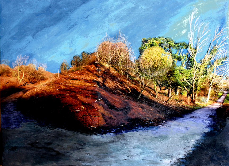 Prachtig licht over de duinen bij het Haagse zuiderstrand. Collagepainting op linnen.