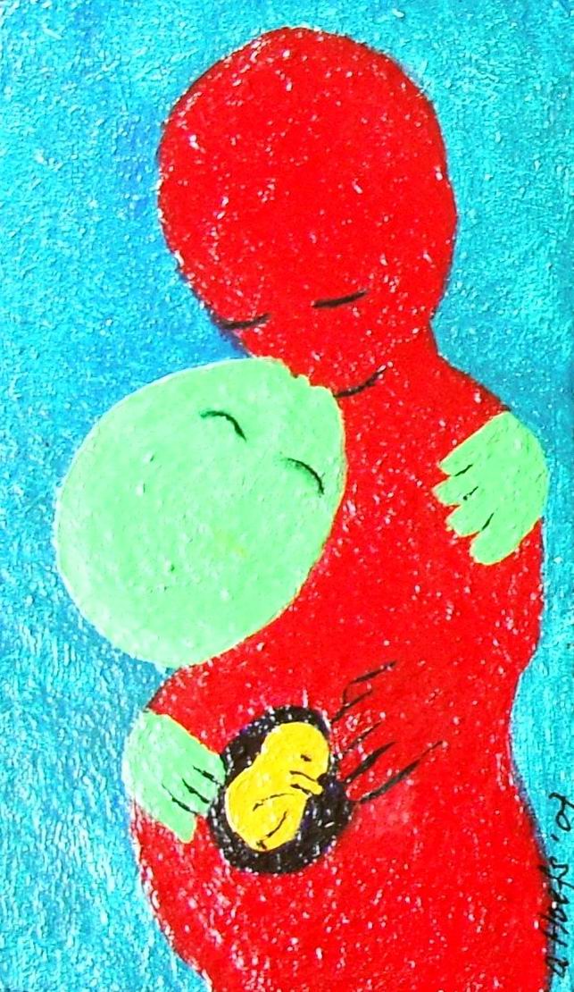 Tweeluikje met in verwachting-1. Liefdevolle omarming; blijdschap over de komst van een kind. Gemaakt in opdracht om cadeau te geven aan stel dat een kind verwacht