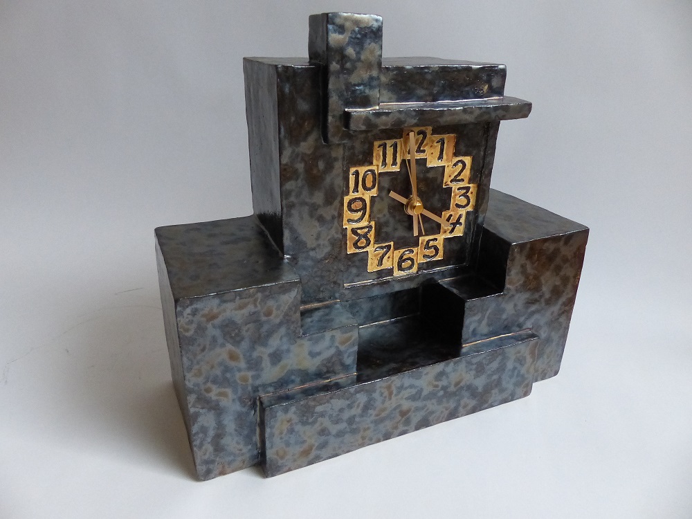 Klok, stijl Haagse School, 1925-1930. Afgewerkt met een Magma effectglazuur Olievlek ME456. Het uurwerk is een quarz klokje. Vijfde model.