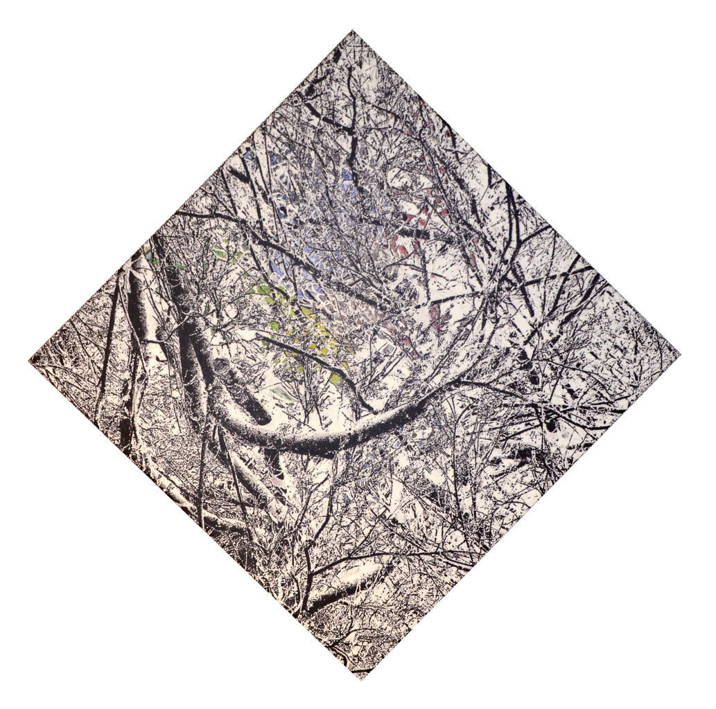 Deze( gekantelde) afbeelding is een zwart-wit afbeelding waar kleur doorheen schemert. De kleur heb ik toegevoegd om de kleur uit mijn etsen terug te laten komen. (uit de serie abstract landschap) Hiermee wil ik het proces in de natuur, het doorwoekeren en de verandering, weergeven. De organische drang tot overleven, bewegen of veranderen. De vraag die ik me hierbij gesteld heb is: Hoe han ik een landschap zo veranderen dat ik de boodschap die achter het beeld schuilt naar voren haal? (zonder de essentie uit het oog te verliezen) Het landschap als metafoor voor de kwetsbaarheid van het menselijk bestaan ten aanzien van de natuur , maar ook de krachten waarover de mens beschikt.