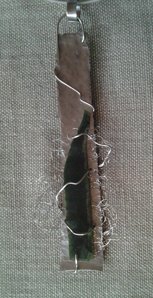 Hanger gemaakt van rvs plaatje met een gemonteerde groene, gedeeltelijk ruwe jade steen met eronder een onregelmatig haakwerkje van rvs draad.