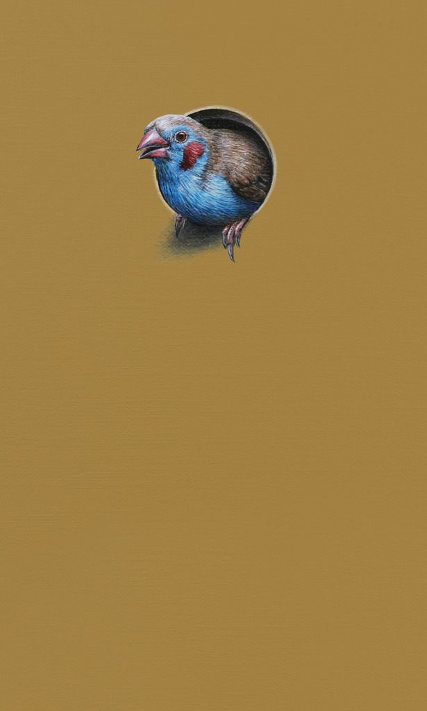 Blauwfazantje (Uraeginthus bengalus). Dit doekje maakt onderdeel uit van de geschilderde installatie 'Multicultural'. Meer informatie over het project kun lezen op de informatiepagina.