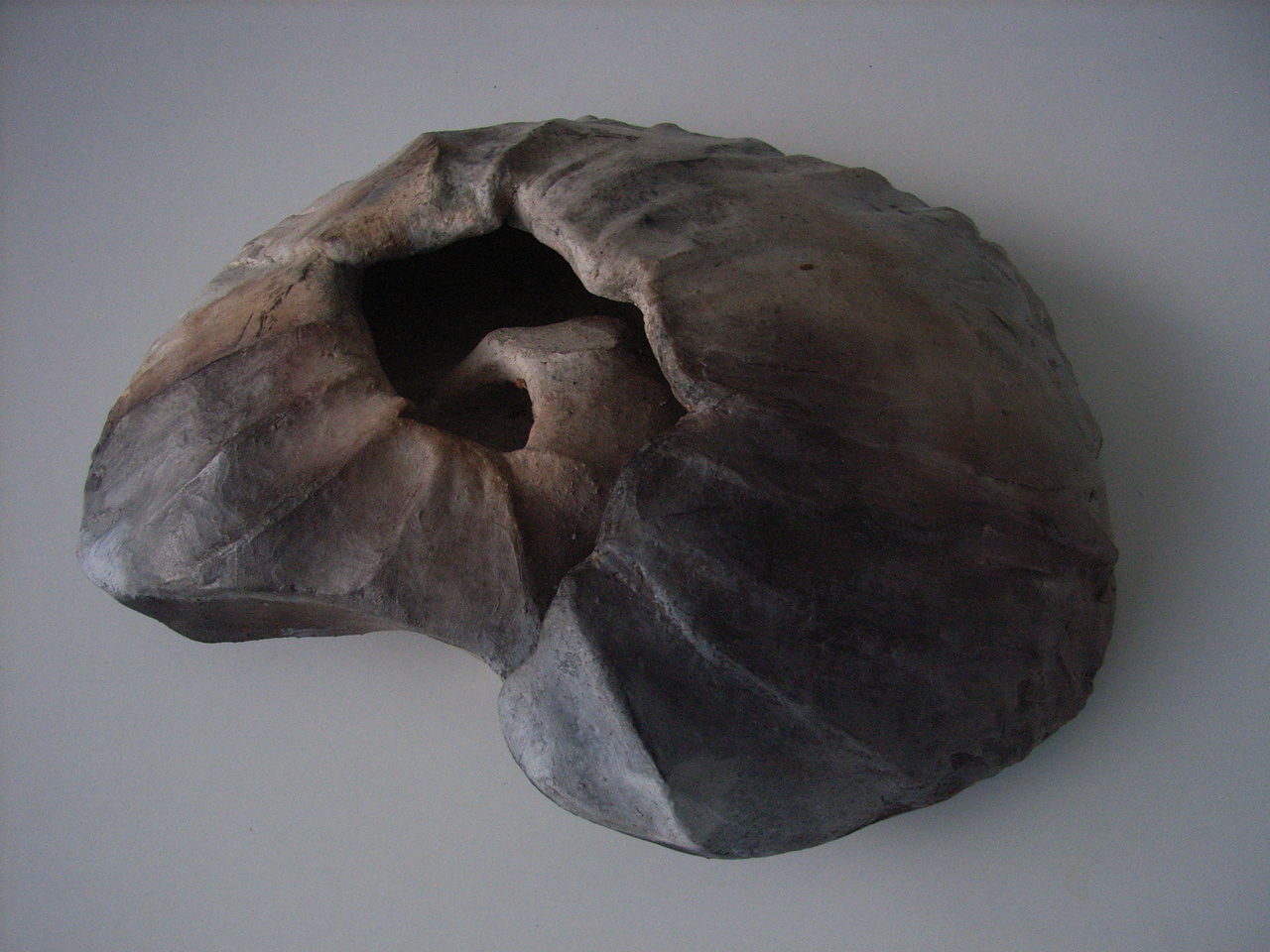 Schelp van aardewerk met kobalt en ijzersulfaten behandeld, daarna gestookt in de papieroven.