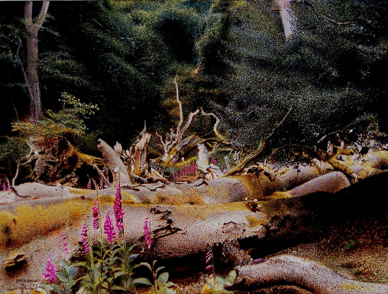 Pieter Kiesouw heeft in zijn werk het pointillisme nieuw leven in geblazen. In de zon zinderende bomen inspireren hem tot schilderen.