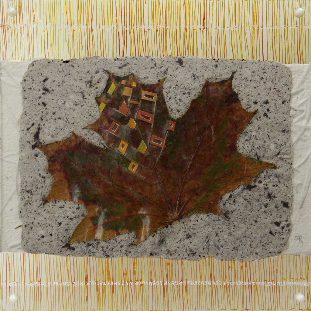 Gedroogd blad met handgeschept papier, tekst in acrylinkt geschreven op perspex, kalligrafie