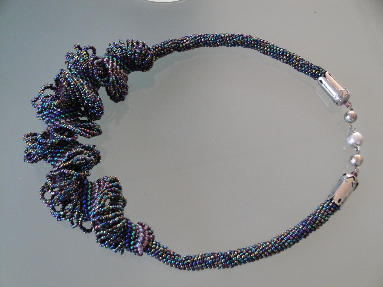 metallic donkerblauwe glaskraaltjes; lengte ongeveer 50 cm
