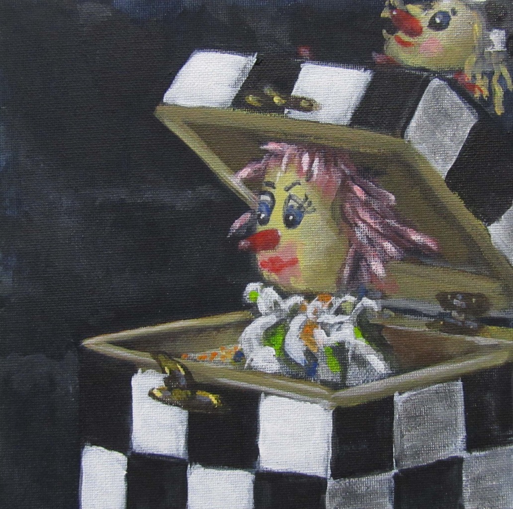 Dit portret hoort bij "Duveltje in een doosje"; want als je het doosje opendoet, krijg je 2 duveltjes uit een doosje. Pas op deze twee schilderijtjes kunnen de clowntjes elkaar aankijken! Deze 2 schilderijtjes zijn los te koop maar ook als tweeluik.