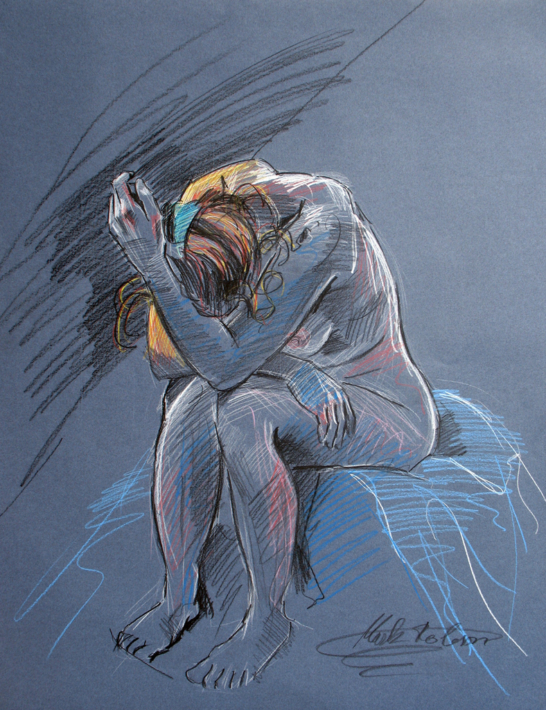 Studie naar zittend naaktmodel. Deze houding beeldt nogal wat zorgelijkheid uit. Pastelpotlood op donkerblauwe ondergrond.
