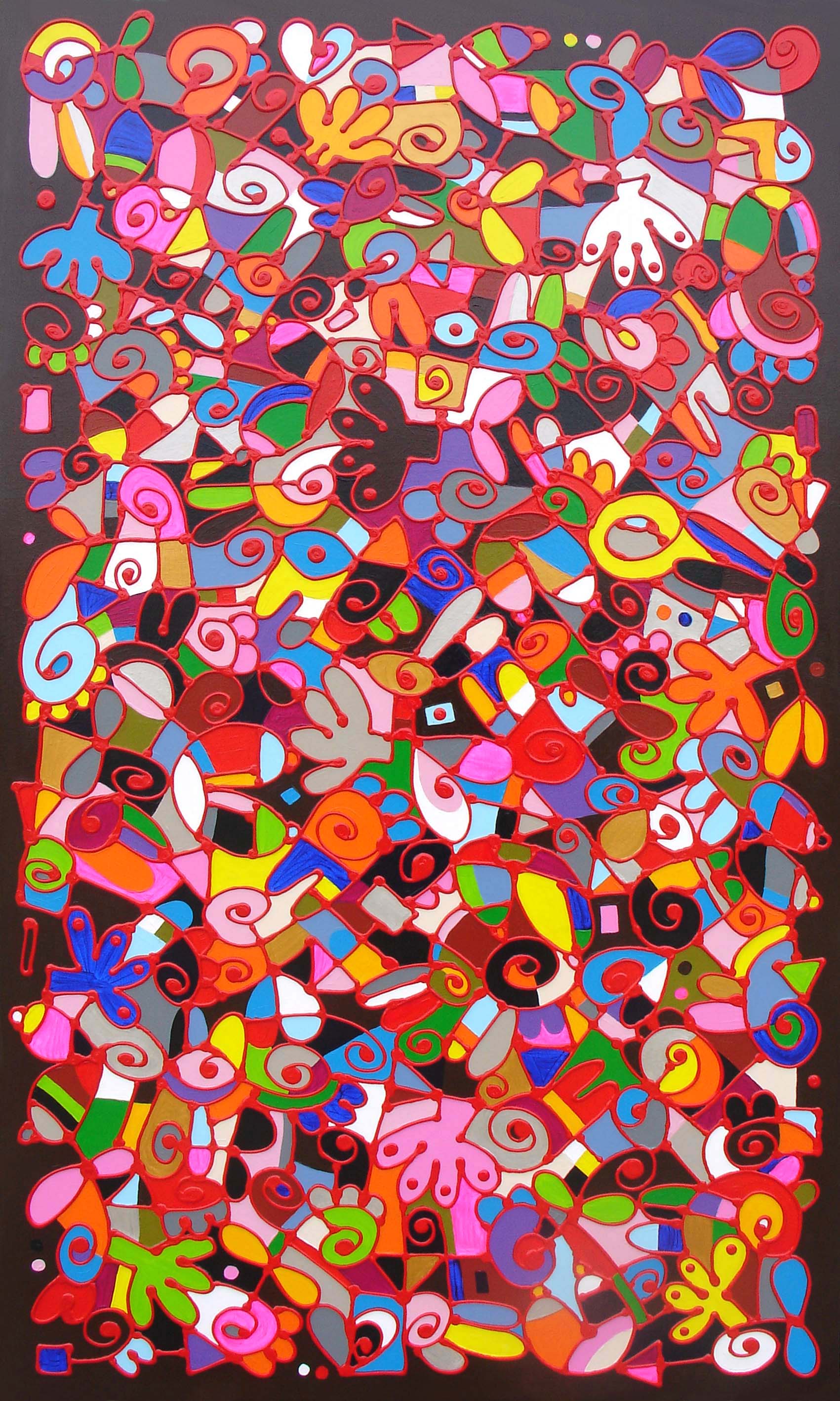Abstract schilderij, vrolijke kleuren, rood, oranje, wit, blauw, groen, acryl, linnen, zijkanten beschilderd,groot formaat, origineel, kunst, verrassende stijl, relief, gesigneerd.