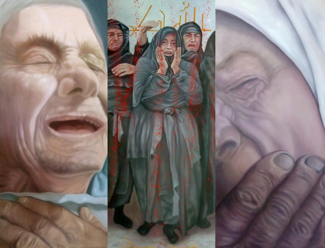 Drieluik, twee treurende moslimvrouwen met in het midden schreeuwende vrouwen bij bomaanslag. In het middendoek in goud in arabische letters "Allah Akhbar, salaam aleikum".