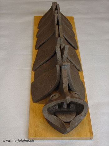 'Rups' Ongeglazuurd keramiek beeld,op een houten voet. Uniek exemplaar.Word verkocht met een certifikaat van echtheid.