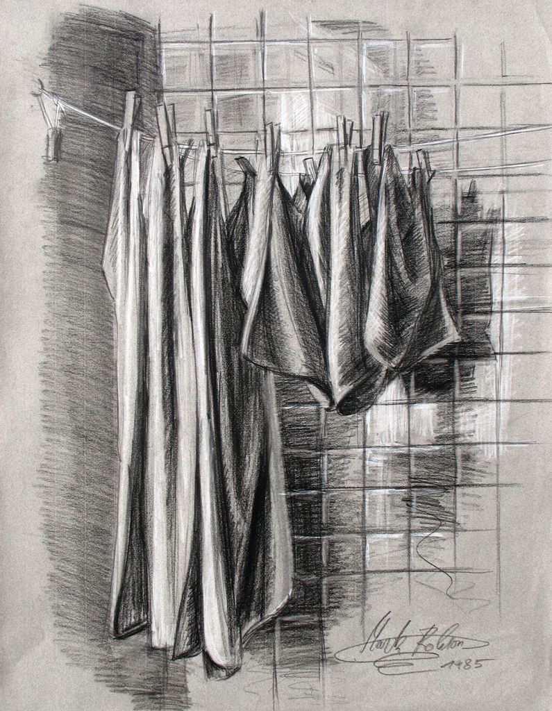 Alledaags beeld van de was, in dit geval vaatdoeken, die te drogen hangt in de badkamer aan een wasdraad boven het bad. Pastelpotlood.