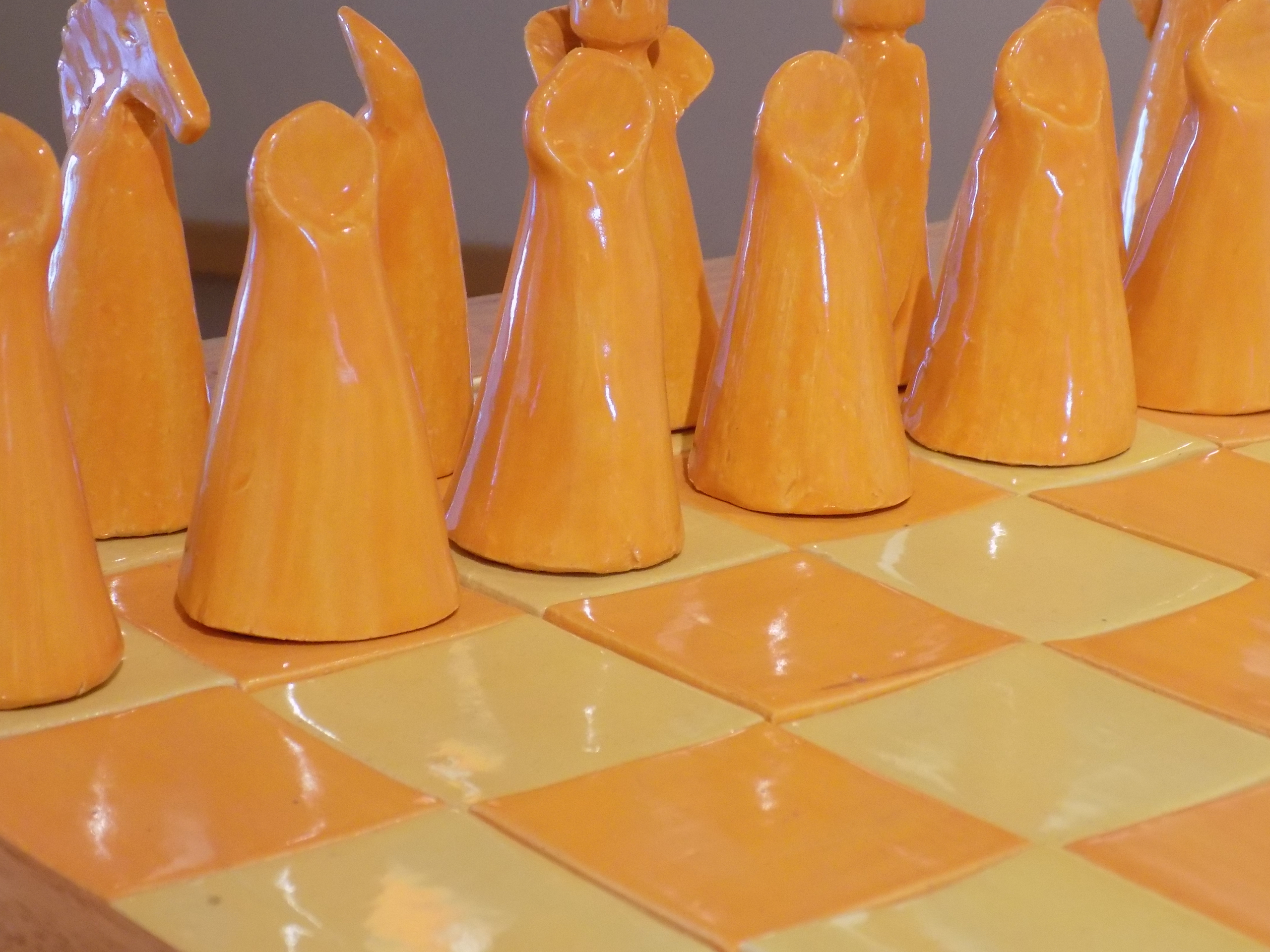 een enige schaaktafel met bovenblad en pionnen in keramiek.Het houtwerk is van palets.
