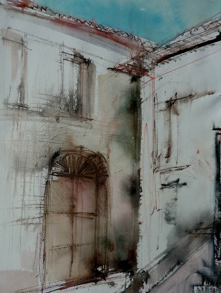 Een aquarel met daaraan toegevoegd inkt en krijt . Het onderwerp is een oud huis in een dorpje in Italie.