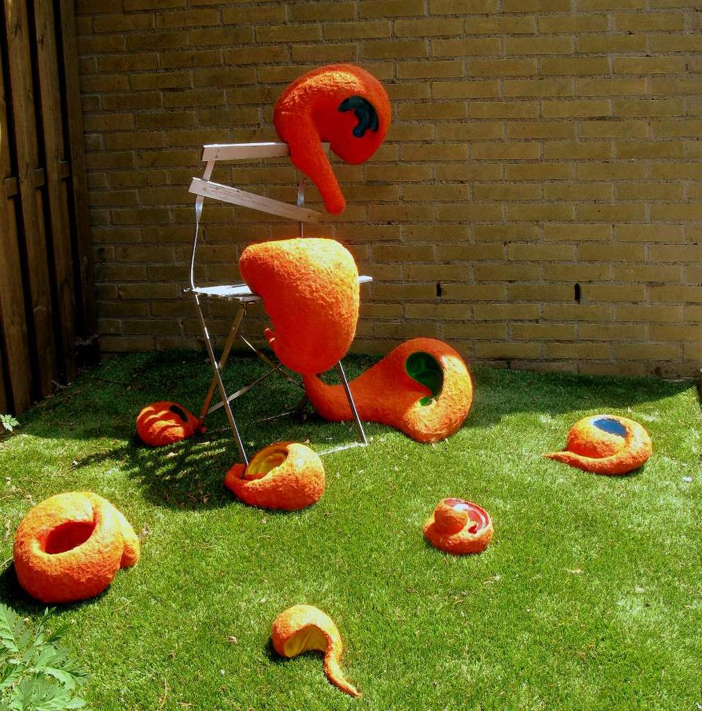 In de wereld van doven is het stil In de wereld van horenden is het vol van geluiden Horen we elkaar nog in deze chaos? Of is het ook bij de horenden oorverdovend stil? Materiaal: acrylic one, acrylverf, synthetische kussenvulling bistrostoeltje