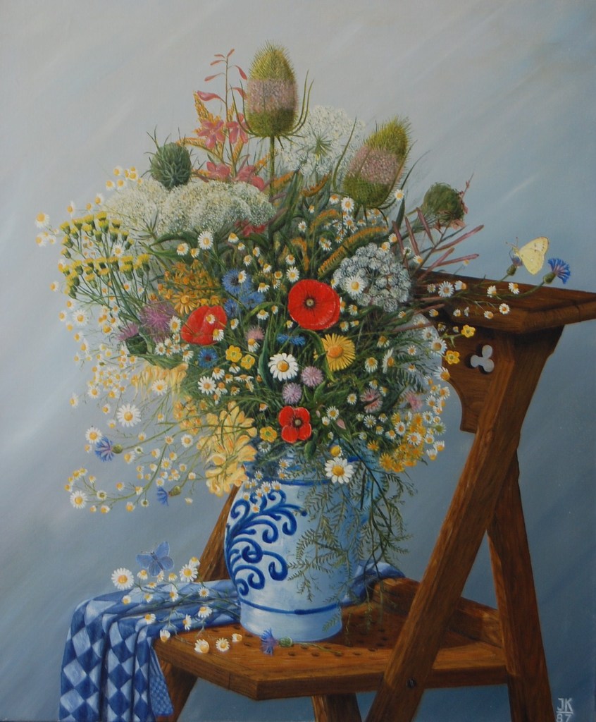 Bidstoel met veldboeket