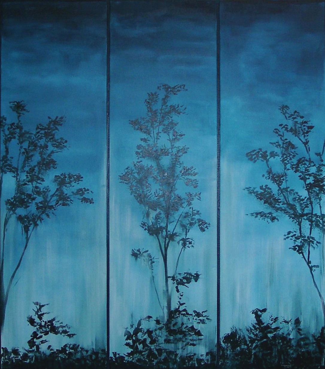 Dit drieluik straalt de rust uit van een avondlijke schemering. Zwarte bomentoppen contrasteren met het resene blauw. Meer uitleg over de natuur als inspiratiebron.