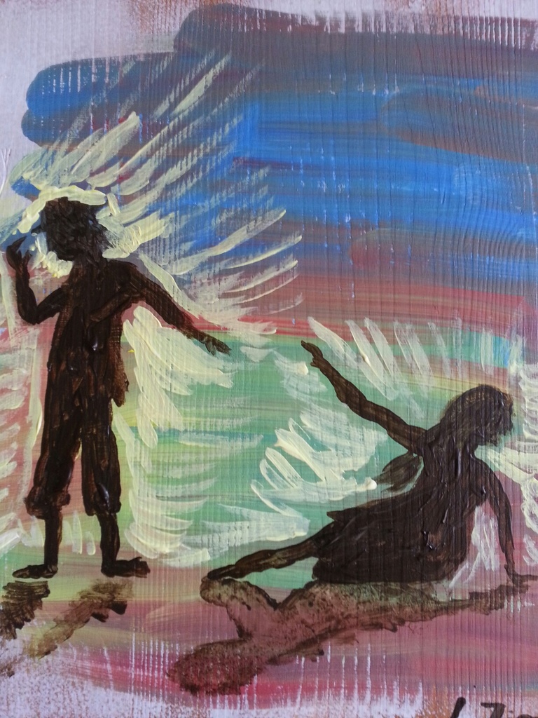 De figuren zijn geschilderd met acrylverf op een houtenpanneel. Twee dansende figuren die een drama uitbeelden.