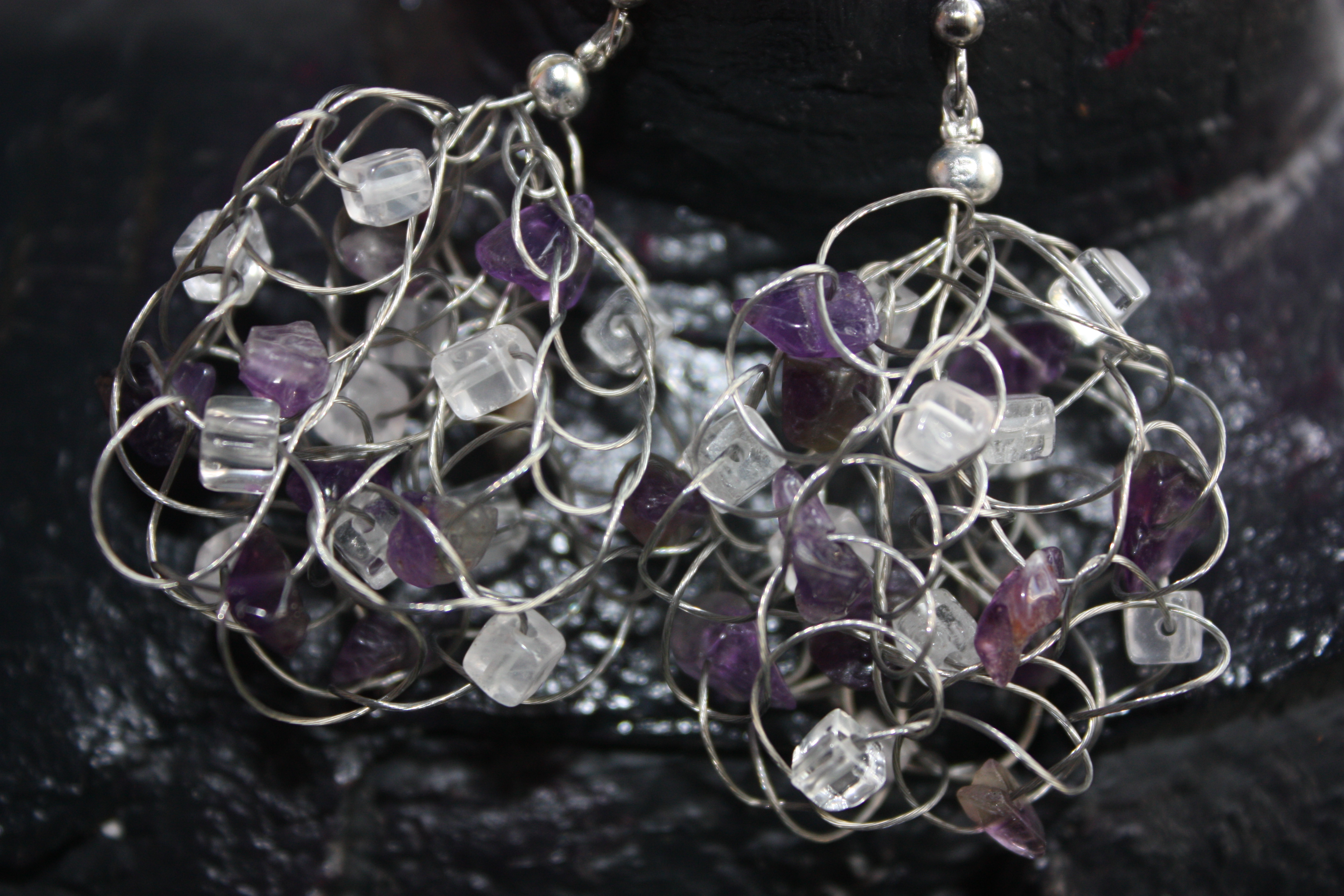 Gepunnikte oorbellen met amethist,bergkristal en rozenkwarts natuurstenen