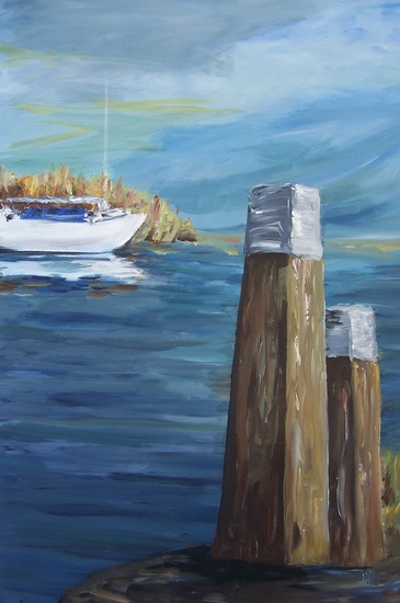 binnenwater met meerpaal en boot op de achtergrond