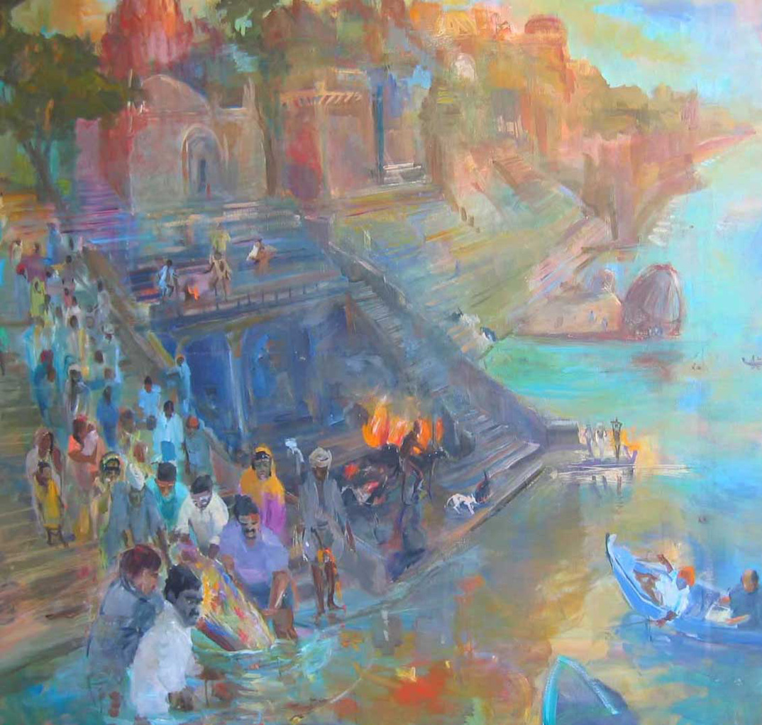 leven dood en reïncarnatie in Varanasi aan de Ganges met de schilder rechtsonder in het bootje