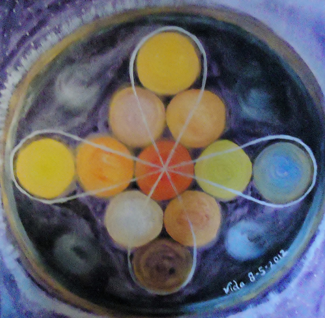 2010 Bewustzijn en ons allen één voelen. We zijn hoe dan ook met elkaar verbonden. Sommigen mogen we tegen komen op ons pad om van te leren of om juist een les te geven. Dat wordt bedoeld met dit schilderij.
