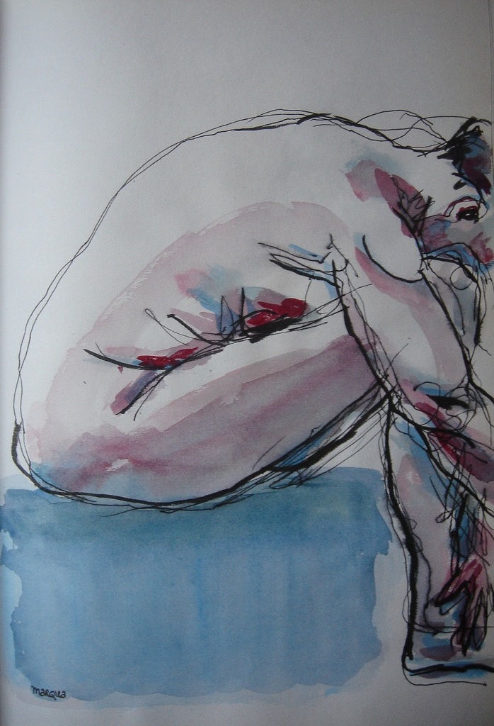 Naakte man, schets Rodin houding, getekend met tekenpen en aquarelverf.op papier 30x40 cm. Zwart, Blauw, lila, wit en rood.