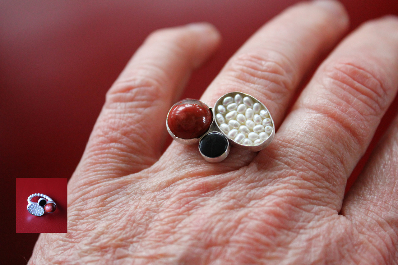 Ring met drie stenen: rode jaspis, zwarte onyx en kleine witte pareltjes. Pareldraad ring
