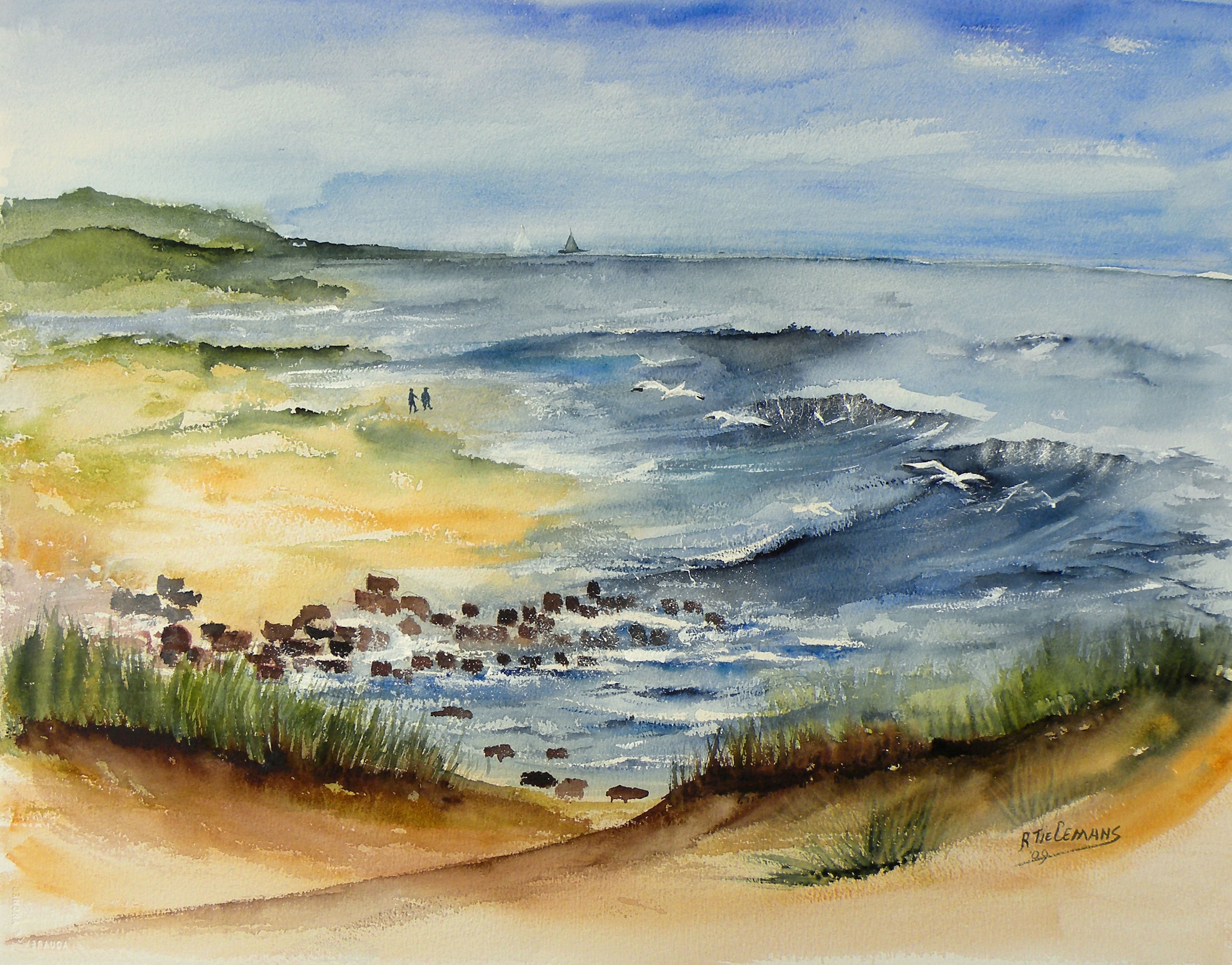 Kunstprinten van dit werk zijn ook verkrijgbaar op canvas, aluminium, plexiglas, posterpapier. Dit aquarel straalt een serene kustsfeer uit. De kunstenaar heeft met zachte, vloeiende penseelstreken een levendig zeegezicht gecreëerd, waarin de golven ritmisch op het strand breken. De lucht is een mix van lichte en diepere blauwtinten, met subtiele wolkenformaties die de indruk wekken van een frisse zeebries. Op de voorgrond zien we een duinlandschap met warme aardetinten en speelse grasaccenten, wat diepte en perspectief toevoegt aan de compositie. De kustlijn is een samenspel van zand, rotsen en schuimend water, waarbij de kleurvariaties zorgen voor een natuurlijke en dynamische uitstraling. In de verte wandelen enkele menselijke figuren langs het strand, wat een gevoel van rust en eenzaamheid oproept, maar ook een verhaal suggereert. De subtiele details, zoals de vlucht van een meeuw boven de branding en de silhouetten van verre schepen aan de horizon, dragen bij aan de dromerige, impressionistische stijl van het kunstwerk. De keuze voor aquarel als medium versterkt de zachtheid en het natuurlijke samenvloeien van de kleuren, wat het schilderij een bijna etherische kwaliteit geeft.