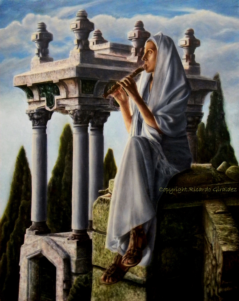 Figurative Fantasy Female Draped Cowl Sandals Music Instrument Flute Serenity Antiquity Greco Roman Landscape Ruins Cemetery Graveyard Columns Capitals Rocks Stones Moss Trees Cypress Sky