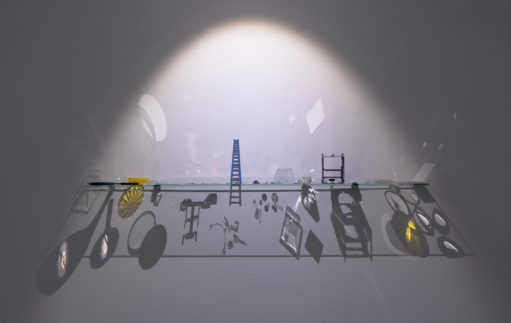 een glazen plankier met objecten, aangelicht door een klein spotlight