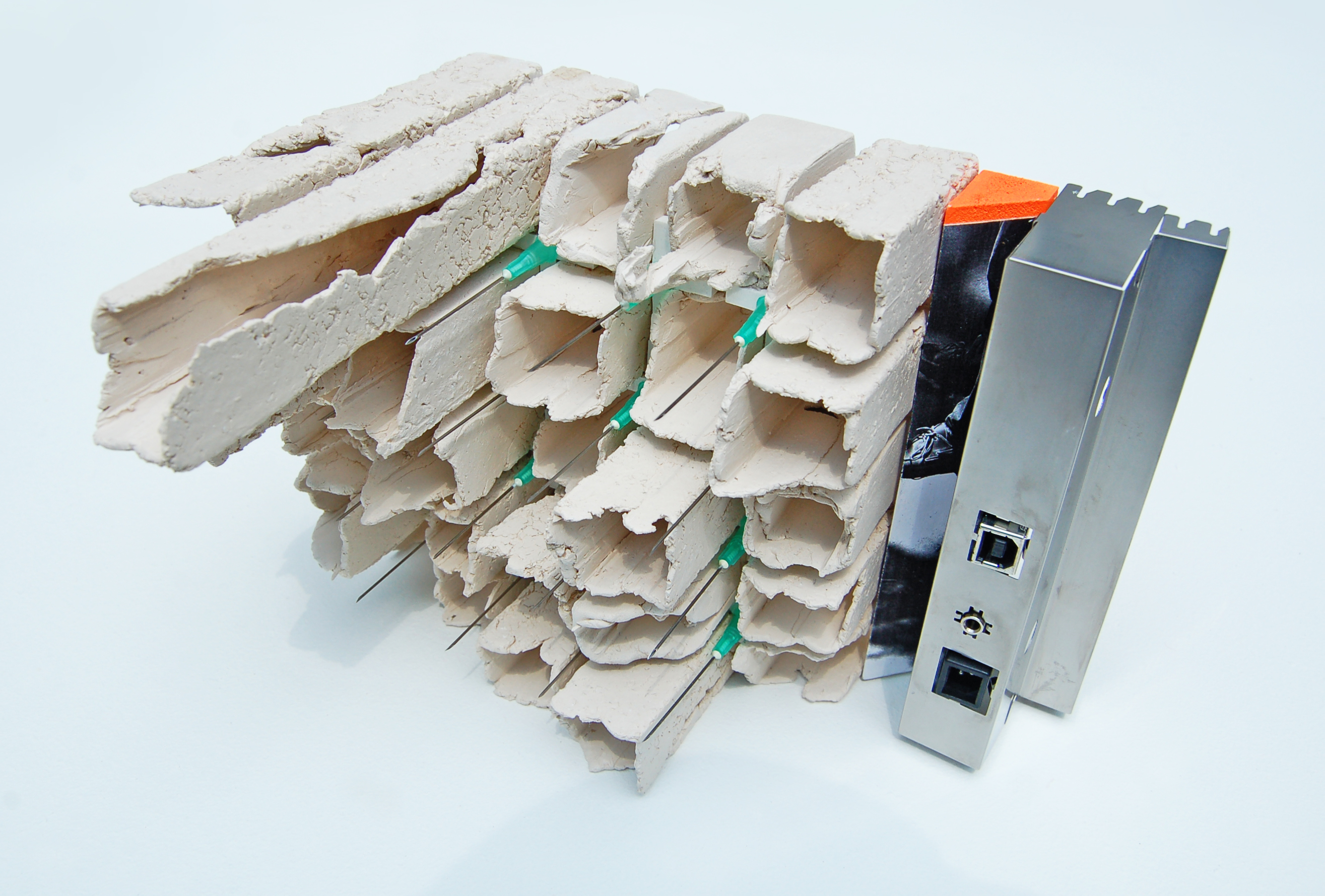 Keramiek, injectienaalden, MDF, computerprint, plastic en aluminium.