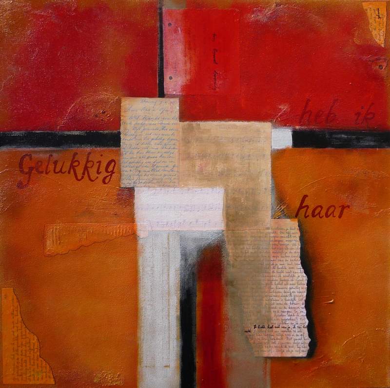 Collage Schilderij Opdracht Vier Vrouwen Oranje Rood Dagboek Brief Notenbalk Muziekpapier
