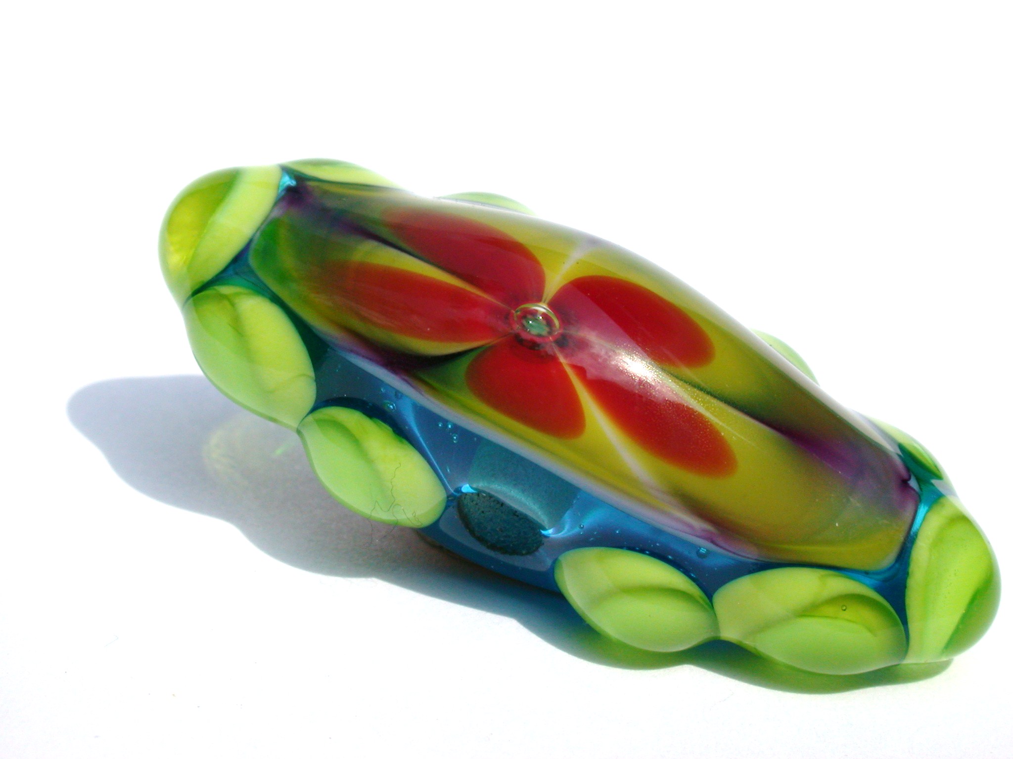 Deze langerekte glazen kraal is aan twee kanten gedecoreerd, over de decoratie is transparant glas aangebracht dat werkt als een lens.